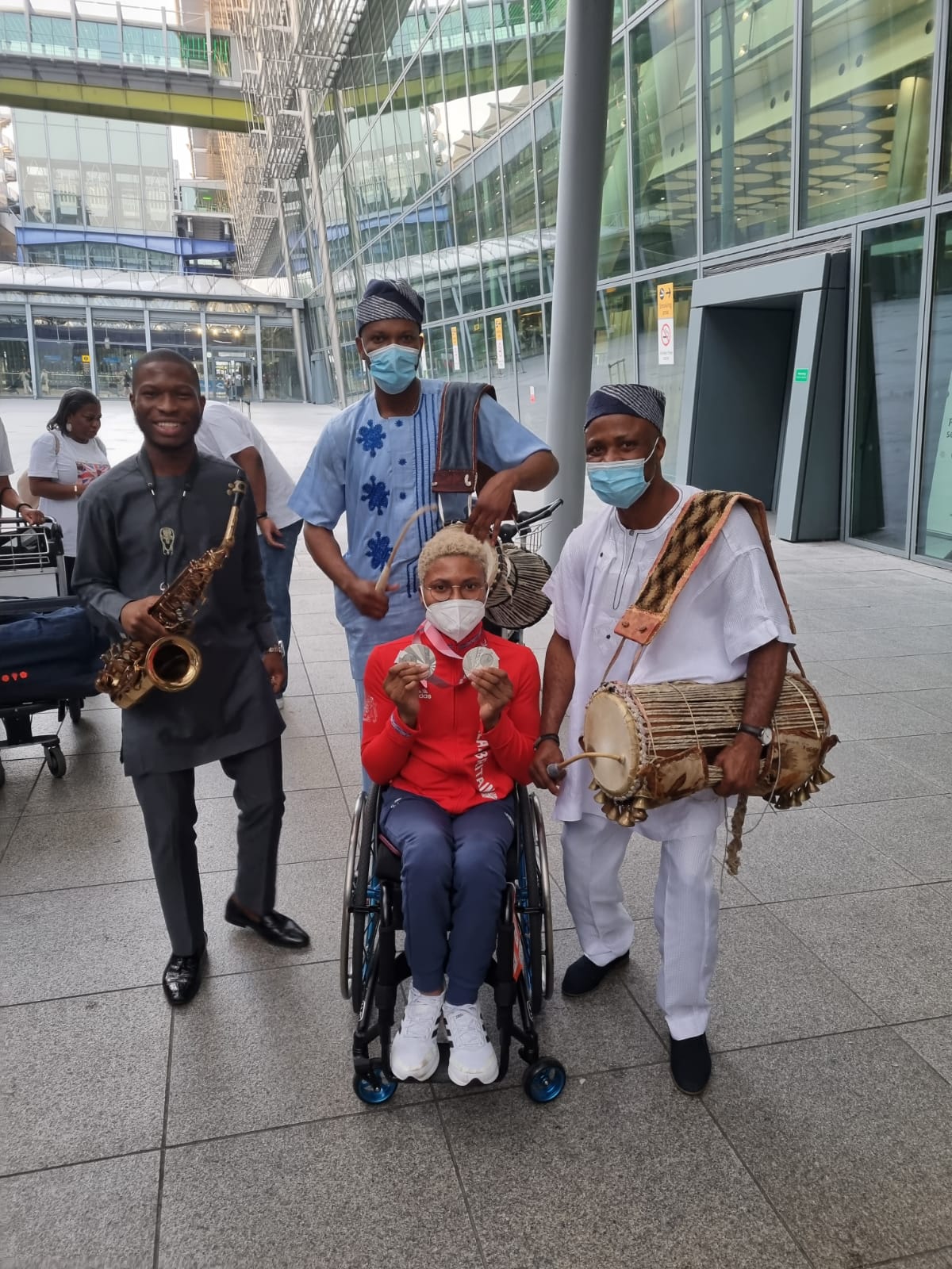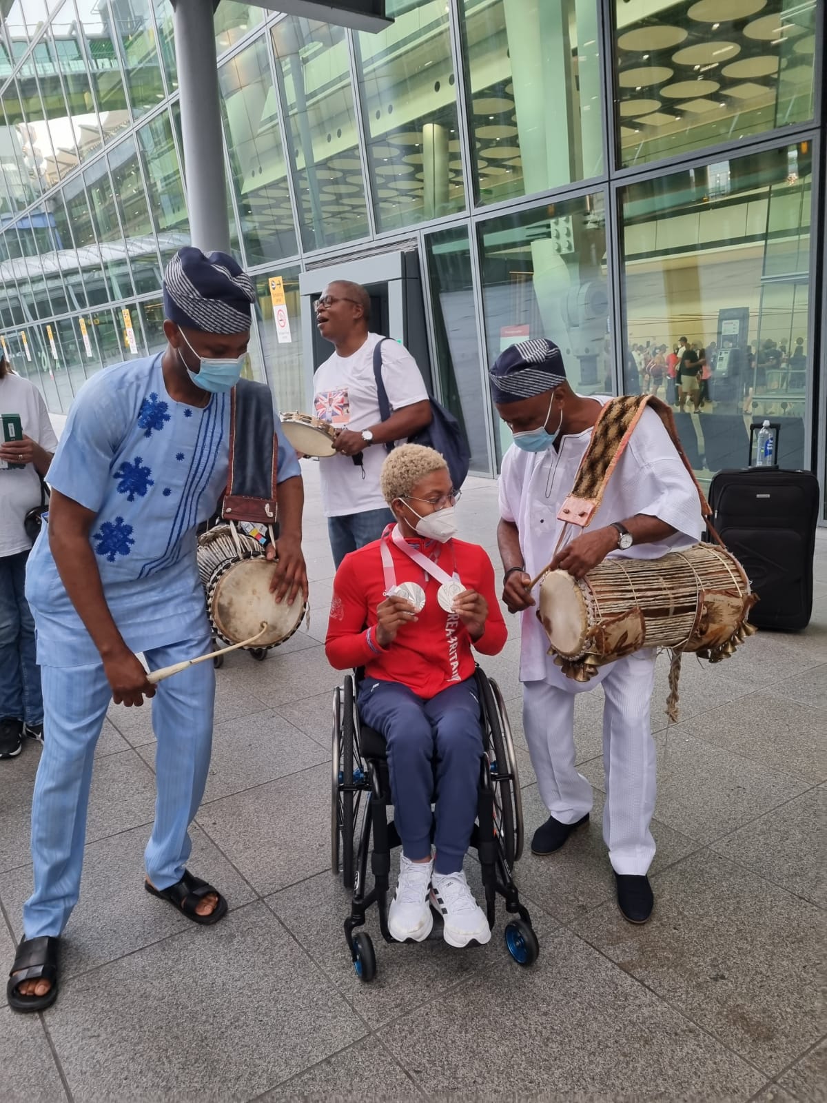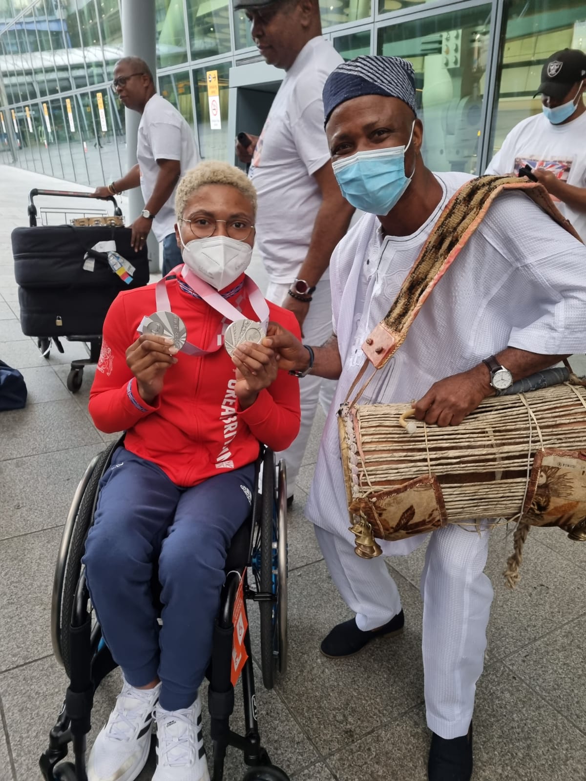 On her return to the United Kingdom with other Paralympic stars, Kare was warmly welcome by her family and well-wishers at the London Heathrow Airport. She was also entertained with a special cultural performance by Africa’s finest cultural talking drummer, Ayan De First-Mr Culture. This performance was Mr Culture’s 7th Show at London Heathrow Airport.