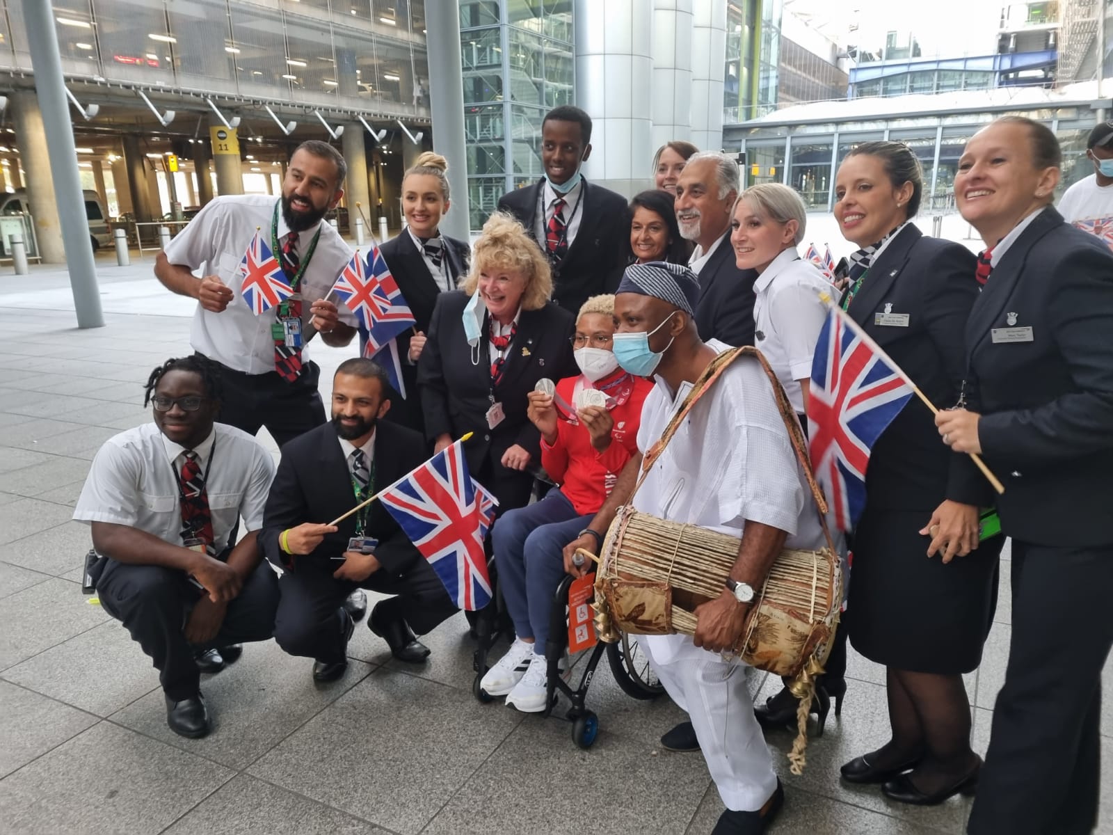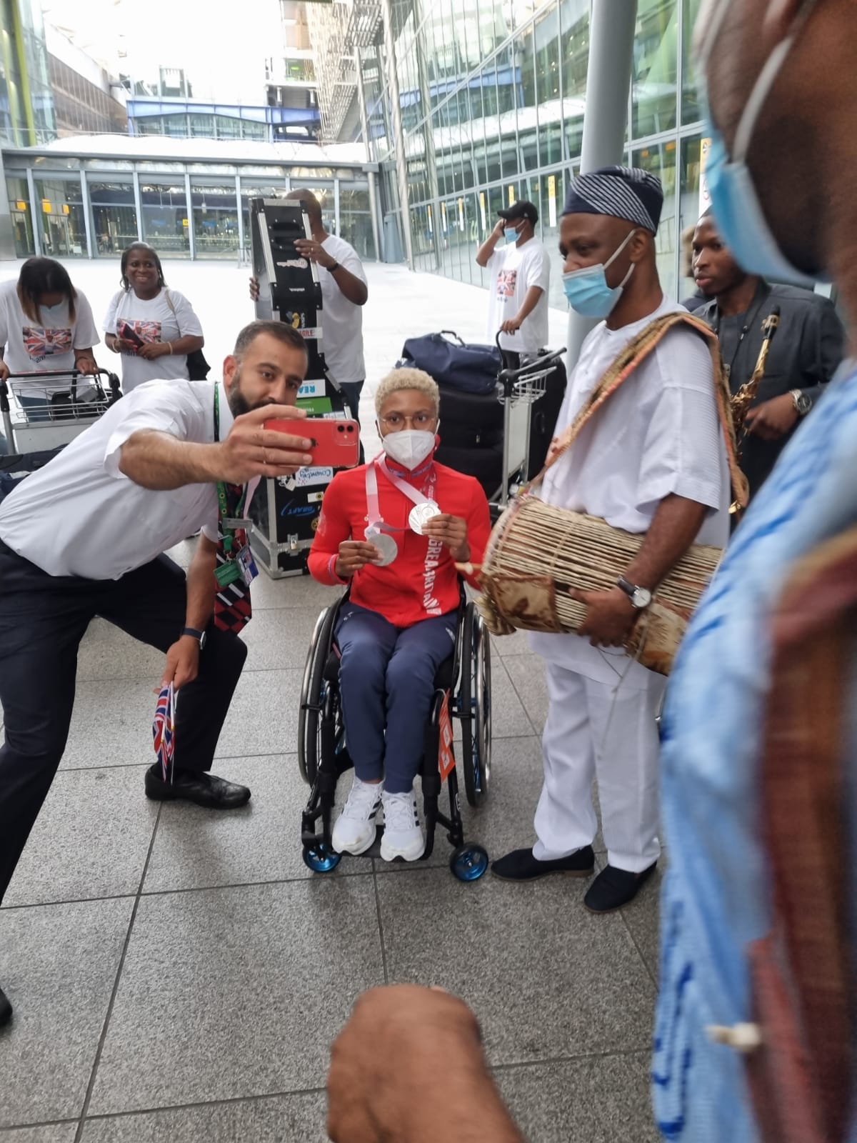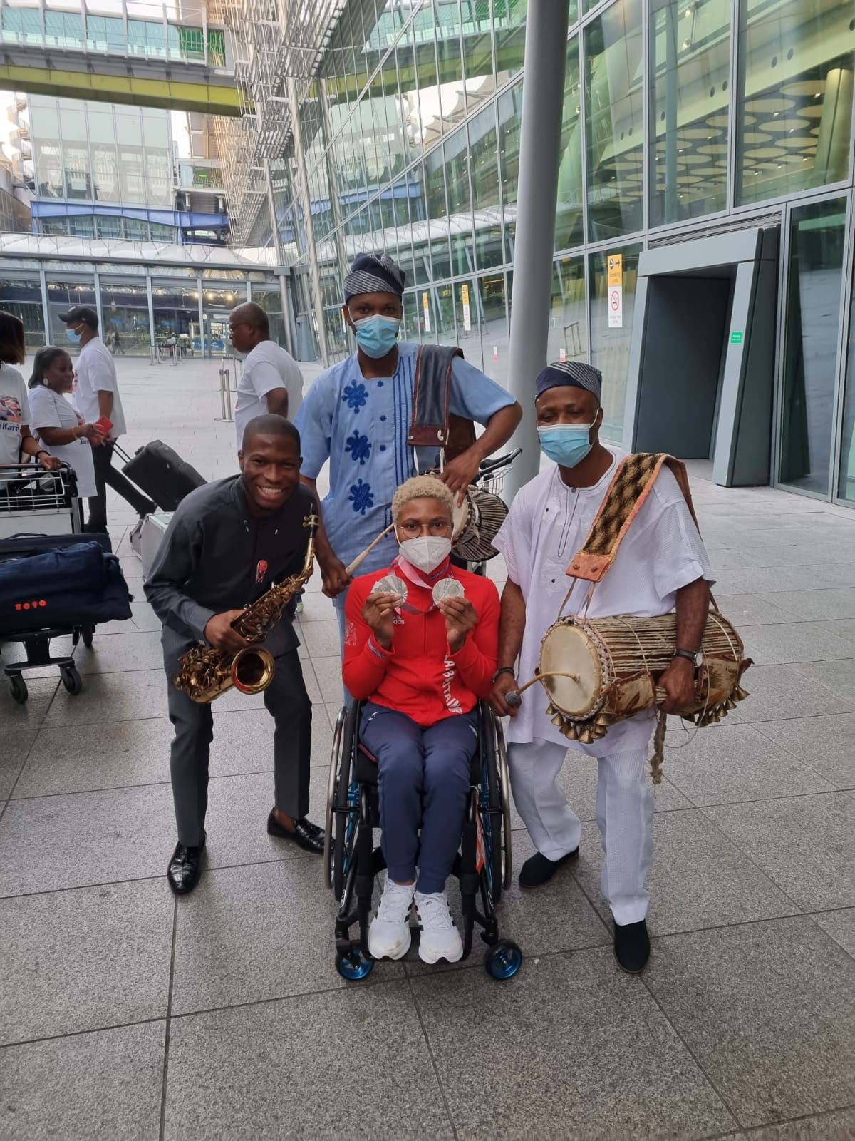 On her return to the United Kingdom with other Paralympic stars, Kare was warmly welcome by her family and well-wishers at the London Heathrow Airport. She was also entertained with a special cultural performance by Africa’s finest cultural talking drummer, Ayan De First-Mr Culture. This performance was Mr Culture’s 7th Show at London Heathrow Airport.