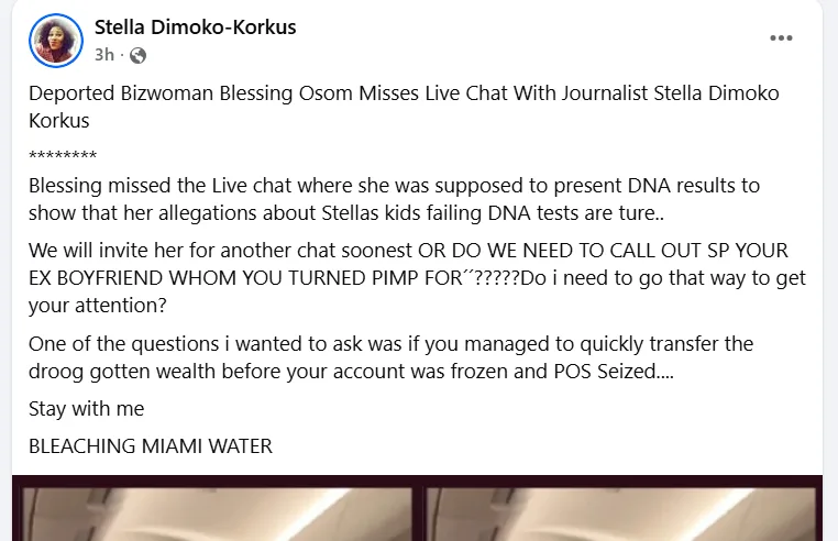 Blogger Stella Dimoko Korkus has stated that businesswoman Blessing Osom, who was allegedly deported, failed to appear for a scheduled Instagram Live session where she was expected to address her claims regarding DNA results involving the blogger’s children.