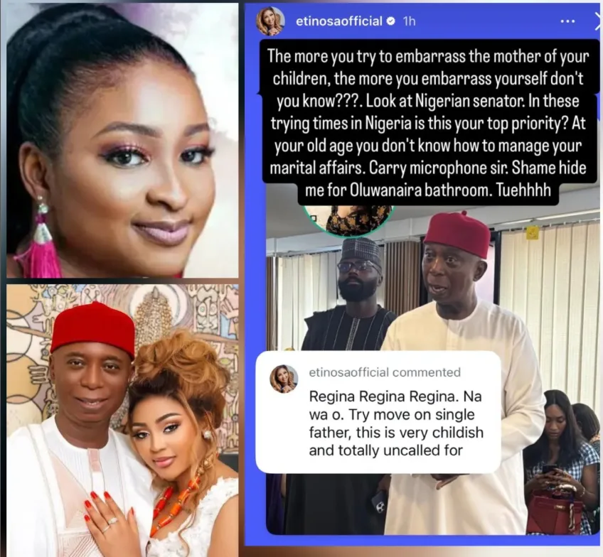 In posts shared via her Instagram Stories, Etinosa accused the senator of repeatedly dragging Regina into public conversations instead of handling his marital matters privately.