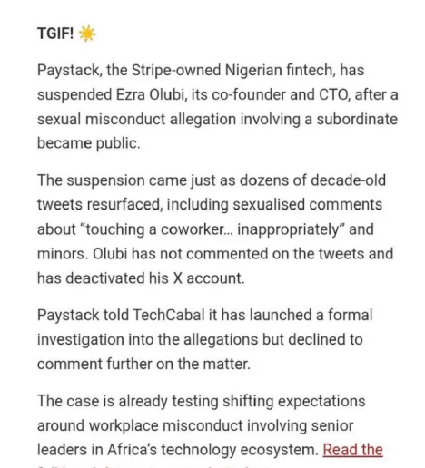 Paystack, the Stripe-owned Nigerian fintech giant, has suspended its co-founder and Chief Technology Officer, Ezra Olubi, following a sexual misconduct allegation and more.