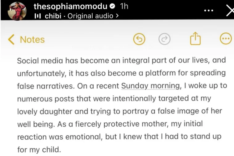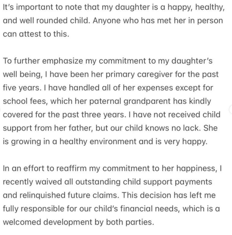 In the statement, shared via her social media page, she said social media has increasingly become a breeding ground for “false narratives,” noting that recent posts targeted at her daughter attempted to paint an untrue picture of the child’s well-being. According to her, her immediate reaction as a mother was emotional, but she felt compelled to defend her child.