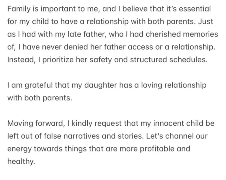 While stressing the importance of family, she explained that she has never denied the child’s father access, pointing out that she only prioritizes structured schedules in the interest of her daughter’s safety. She expressed gratitude that the child maintains a loving relationship with both parents.