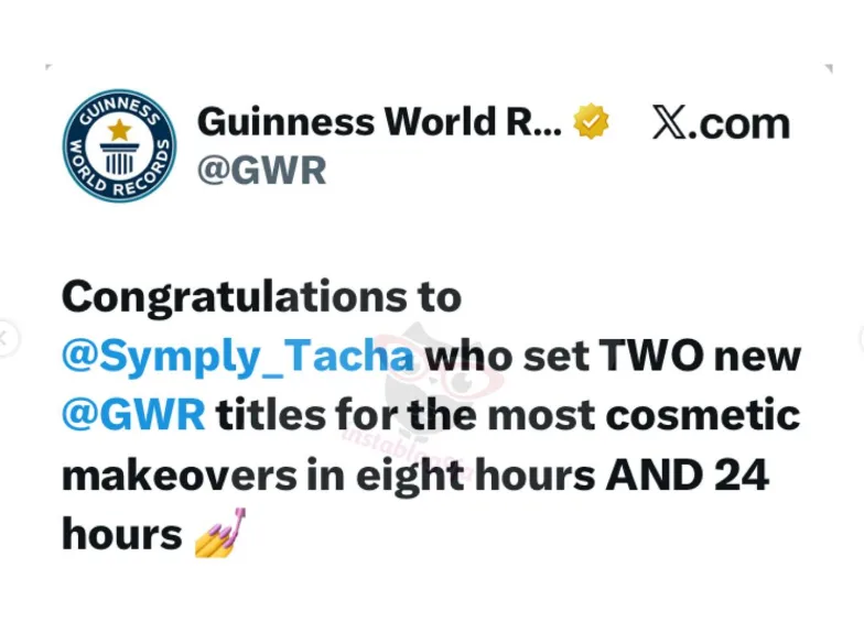 Media personality and reality TV star Tacha Akide, popularly known as Tacha, has set social media abuzz after achieving two new Guinness World Records for the most cosmetic makeovers in 8 hours and 24 hours.