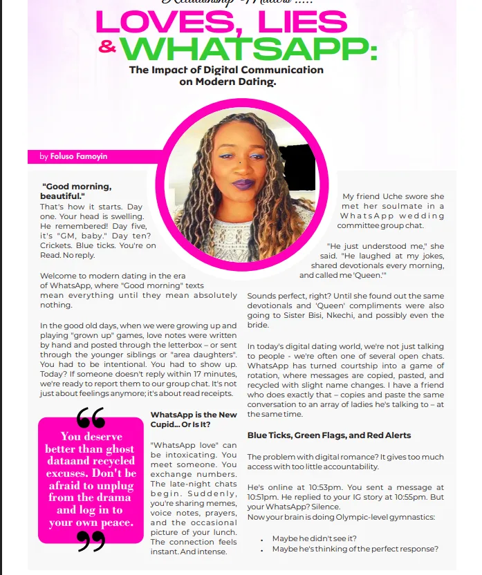 Foluso Famoyin writes on the Impact of digital communications on modern dating on the 10th Issue of Charming Magazine.