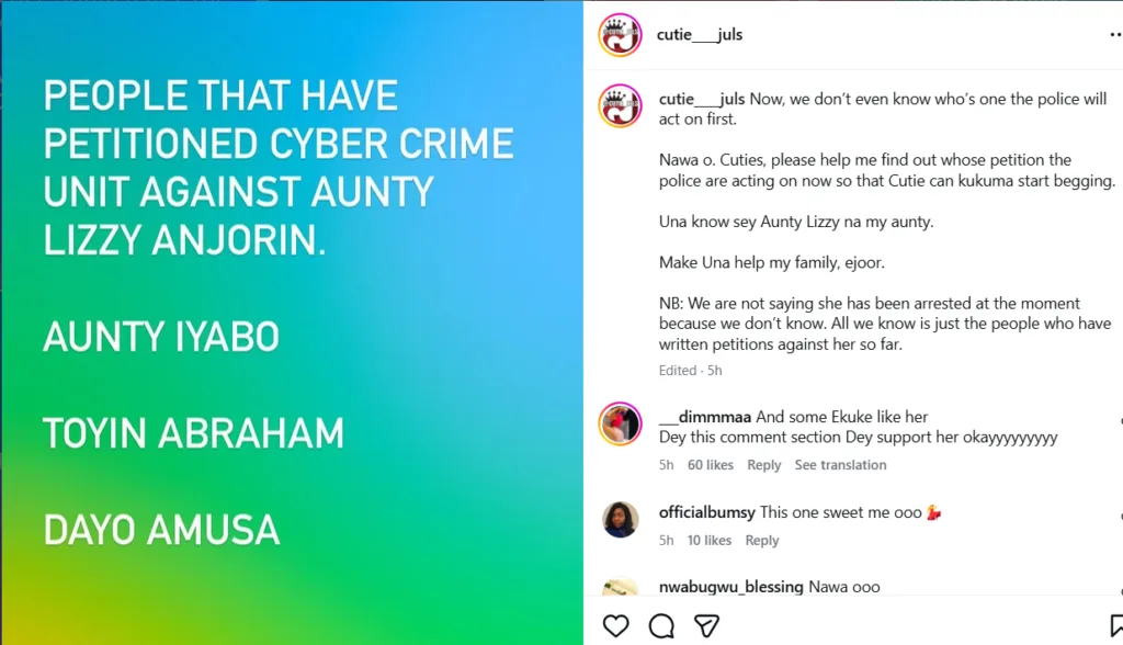 While details of the petition have not been officially released by the police, the move is believed to be connected to a series of public videos and posts in which Lizzy Anjorin allegedly mentioned or alluded to fellow actresses in a negative manner.