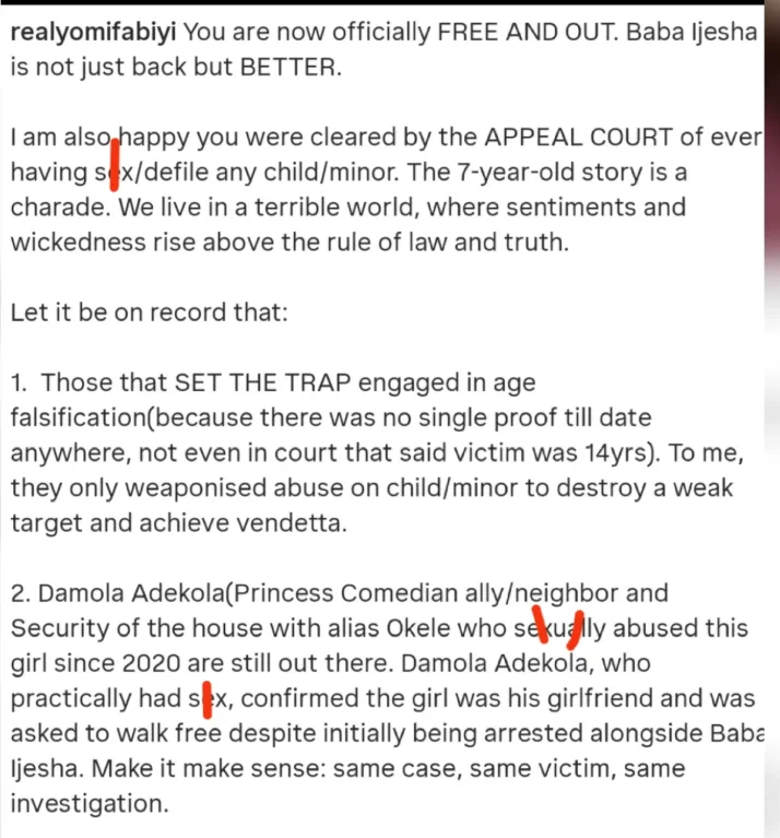 Fabiyi applauded the parts of the court’s judgment that favoured Baba Ijesha, adding that he believes some aspects of the original accusations, particularly those involving a minor, were, in his view, mishandled.